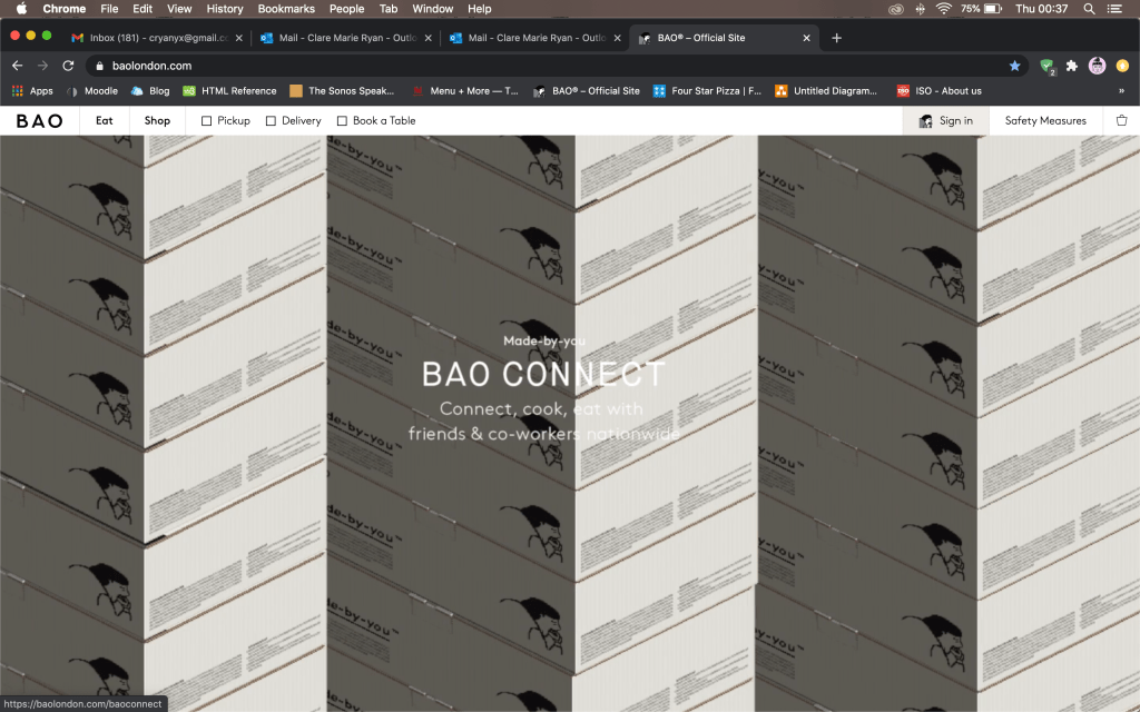 From the get-go, Bao London website is a beautiful one with a very artistic, trendy, lo-fi aesthetic that is at once fresh and exciting. In its homepage you are greeted (taking up almost the whole page) with a cool video of branded takeaway boxes stacking up on each other and covering the screen, illustrated with its distinctive lo-fi, pixelated aesthetic. I found that this is a video source (looped) with the code <div class=”video-wrap”> and the video itself is an uploaded mp4 file. I also like the crawler at the top promoting complimentary national shipping which is a text marquee, reminiscent of 90’s style HTML/CSS lo-fi websites.