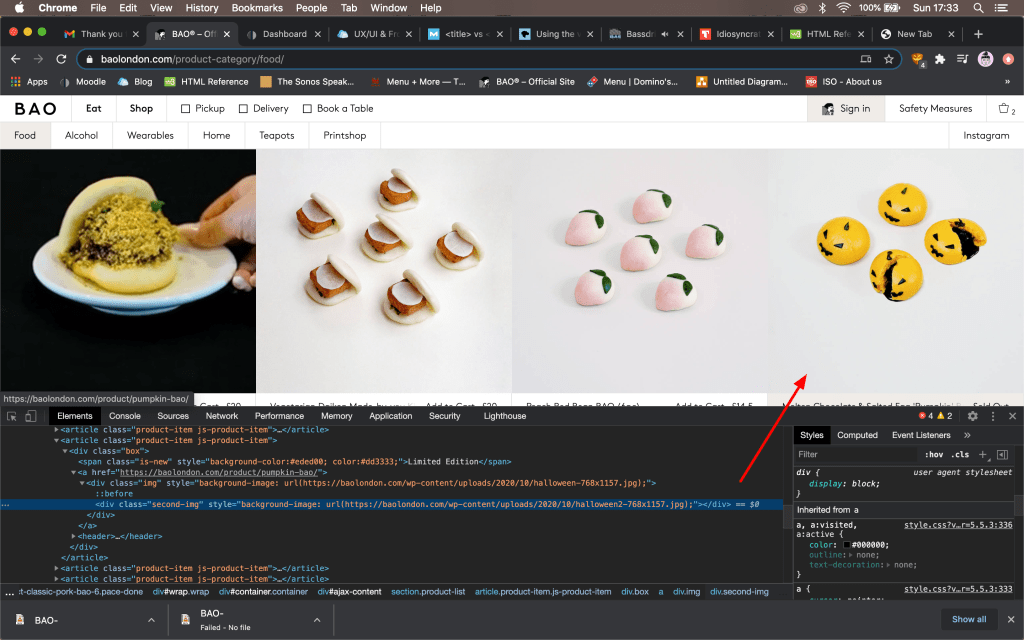 The overall colour scheme of the website is monochromatic with all the text and navigation menus in black and white. Navigation buttons have a simple rollover effect that highlights the area when your cursor hovers over. In the menu, some thumbnails use video loops (also uploaded mp4). I especially like that some items uses two images so that when your cursor hovers over the item, it changes to a picture of the food product, with a bite taken out of it. The code for this is <div class=”second-img”>. In the navigation bar, the website uses 8-bit type graphics, some animated gifs, for icons such as “Shop Home Kits” and “BAO Borough” which I find visually very well designed. I would like to additionally note that the website utilises minimal JavaScript.