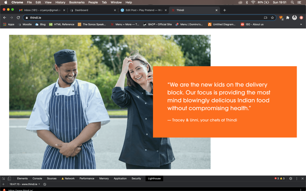 Bao scores 57% on Lighthouse for mobile device performance, fairing better than Thindi and Domino’s. The lead suggestion from Lighthouse is “serve images in next-gen formats” listing JPEG 2000, JPEG XR and WebP as image formats with better compression than JPEG and PNGs. It also suggests using an image optimisation WordPress plugin for a list of images that are relatively large in size and resolution, for a mobile network to load.