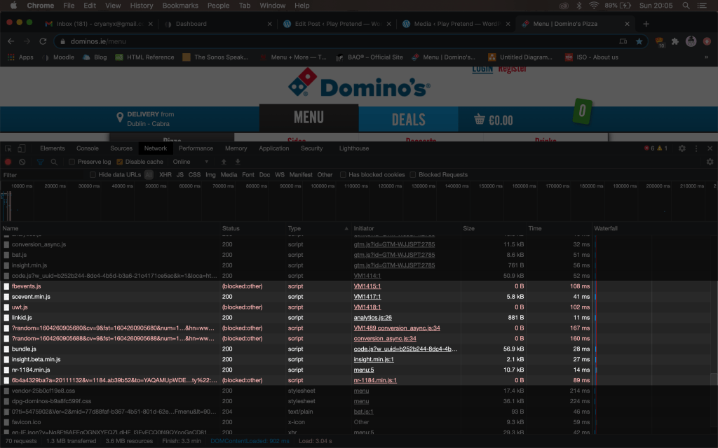 Domino’s website is very brightly coloured with animated effects through out the navigation of the page. For example, the navigation bar at the top has a rollover buttons that change from blue to red (Domino’s primary brand colours) when your cursor hovers over. With a load time of 3.04s for 69 requests, I find the site fairly optimised for performance. In Chrome Dev I have identified 5 blocked scripts- this should be removed. Interestingly, I found the same fb.events script that I saw on Thindi’s website.