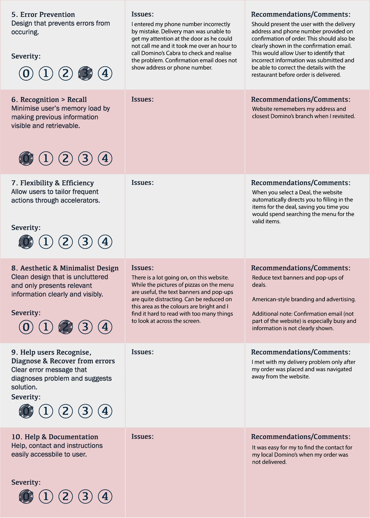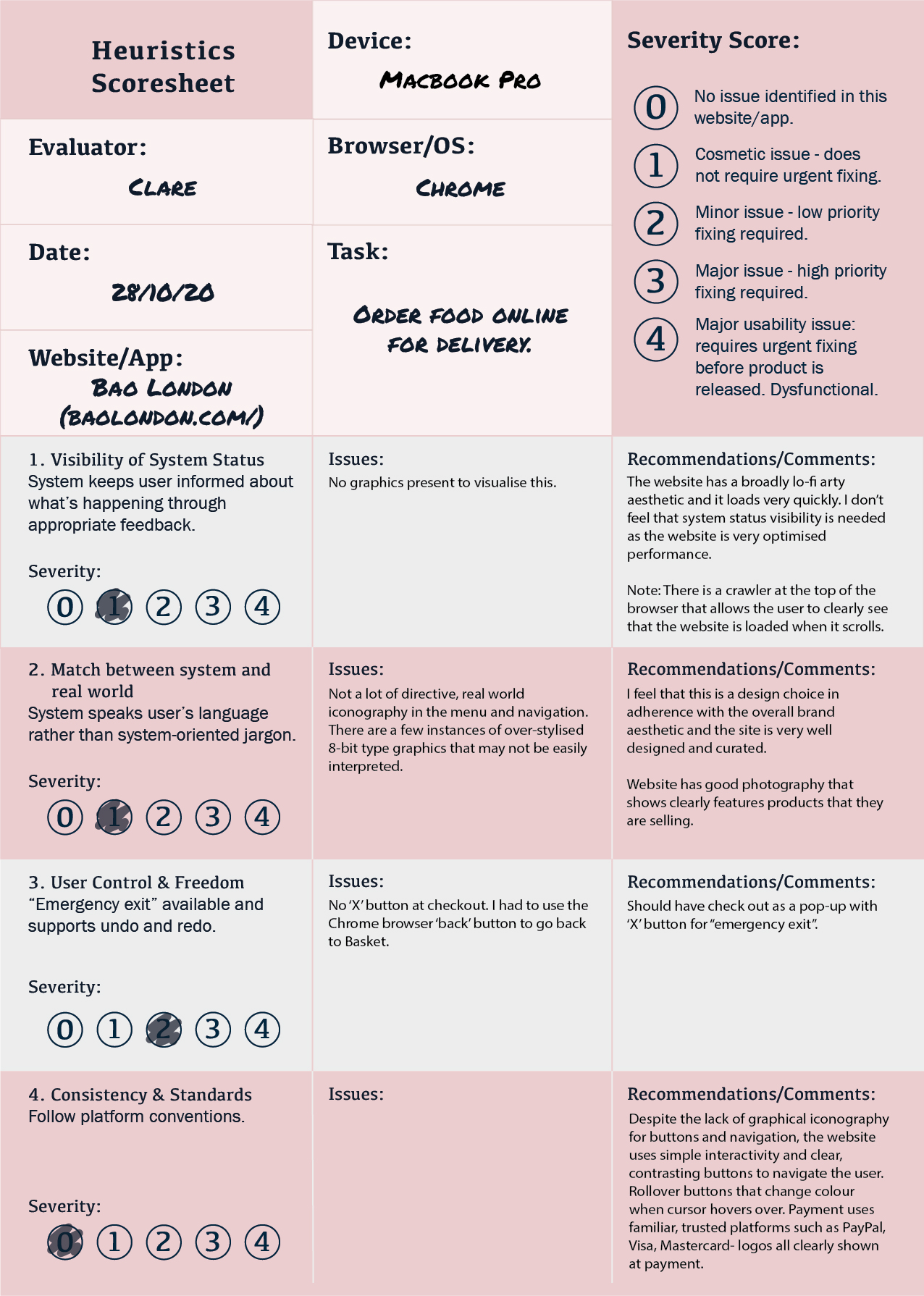I have designed a scoresheet (please open image in new tab to zoom in) which will function as a checklist for the 10 Heuristics. On this I have noted down issues, comments and recommendations. After each brand assessment, I will highlight the pros and cons of the website, throwing a spotlight on key usability strengths and issues that I encountered while completing the user task of ordering food for delivery on the website.