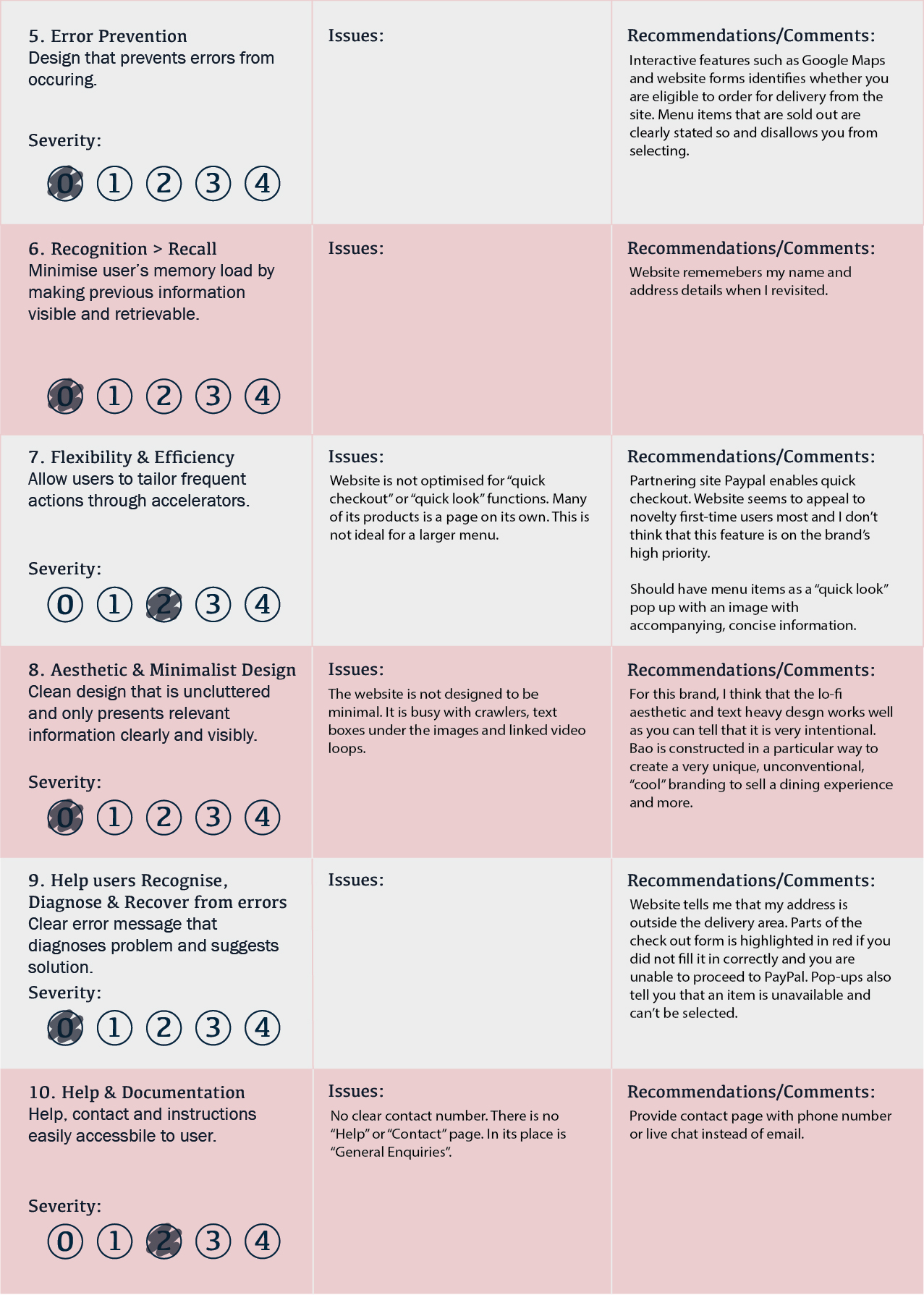 While I found the Heuristics very helpful in preliminarily assessing a site, I think that it is important that they are viewed as effective guidelines that can analyse most, but not all brands and design. For example, my personal favourite of the three brands is Bao London which by the Heuristics, scored poorly. I feel that the 10 Heuristics does not account for artistry and some decision making that goes into design and brand identity of the site. Often, to be exceptional or truly novel and unique, one has to break rules. I agree that there are basic principles to adhere by in UX, but there is always room to be bold with design choices, whilst always keeping the User in mind. The Heuristics is also unable to comprehensively assess technical construction and functionality of the website, lying on the web development end, which has equal importance in the success of a website / app. In conclusion, while effective and useful, The Nielson’s 10 Heuristics also has its limitation that a UX researcher should not fail to acknowledge.