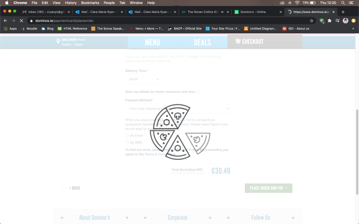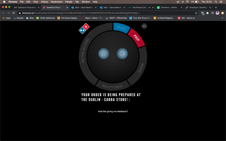 Pros: Delightful, effective graphics and animations throughout the website. The graphics are well used to support Heuristics #1 Show System Status, where it shows a screen loading and impressively, showing where your pizza is in the delivery order- from being prepared in the kitchen to on its way to your house. Website has a “Hiring” page much like the requirement in client brief. Ordering process was very clear with the help of images for each and every ingredient, especially through the “Make Your Own Pizza” process. This is an example of #2 Heuristics, Match Between System and Real World, where imagery, icons and lists are used to make navigation and ordering process clear to the User.