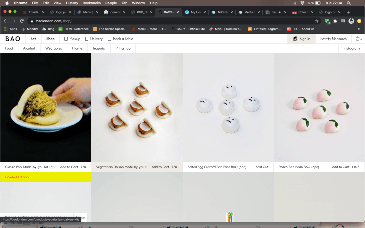 Bao London has its text too small in my opinion. It is hard to navigate when the drop-down menu buttons have a small font size (14px). The layout can be better improved with a greater variety of font sizes and spatial use to differentiate between headers, descriptions and buttons. The homepage however well features its 3 directive promotions- Bao Connect, Made-by-you Kits and Bao Bakery Goods. It is hard to miss these three sections with text clearly legible on pictures. This detail should be applied throughout the website’s navigation.