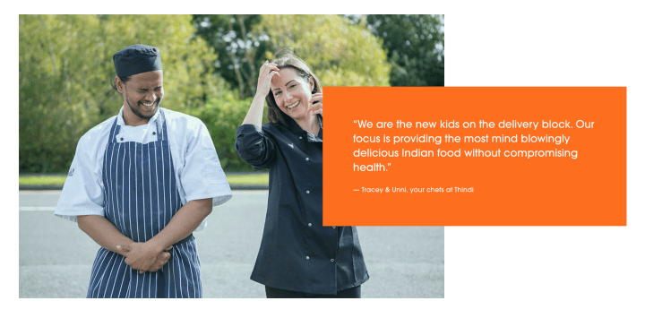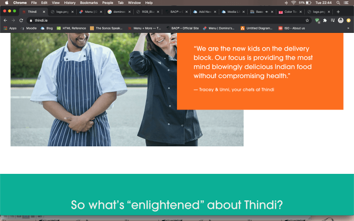 Thindi adopts a complicated, contrasting colour palette for its website. While its logo uses Red and Yellow, these colours are not referenced in the website. Instead, I find Orange (#fc6e1f) to be the primary colour even though it does not command the most visual weight on the page. I come to this conclusion because the key buttons (Order Online) are coloured Orange to draw attention and it is the first noticeable block of colour on entering the homepage. Moreover, Orange seems to have been used to match a lot of the food photography of their curry dishes. I find orange to be quite a common colour used on food websites (ie. JustEat), as it is an organic colour found in food, although on Thindi it is much brighter than organic. Orange is appropriate for an Indian takeaway as it evokes a sense of heat and spice in cooking. The brightness emotes energy and optimism, feelings of which consuming food should give you.