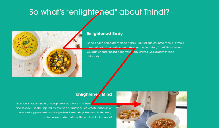I like the varying alignment of sections of Thindi’s website. As mentioned, it chooses an alternating left and right alignment of sections (REF 10). The corresponding, accompanying text to each of the pictures have a close proximity and alignment to the picture ensuring a clear message.
