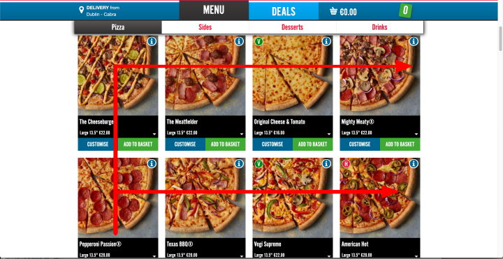 Domino’s has a Z-viewing pattern followed by a F-viewing pattern on its thumbnail menu when you scroll down.