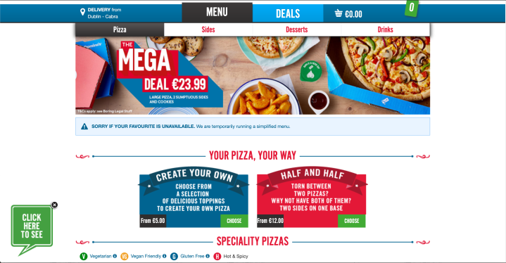 On Domino’s, the layout adopts a more list-like menu with the logo and promotions well, sizeably featured at the top followed by thumbnail pictures of pizzas listed below. The website is well balanced with good attention given to banners, pop-ups and promotions. It is easy to navigate to order food.