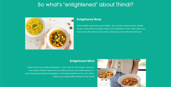 There is little play with perspective on Thindi and the website is mostly graphically plain and flat. Some food photography has a soft blur which makes the overlaying white text more prominent.