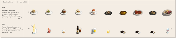 While most of the layout is quite standard and basic, there is a section on Bao website that I found visually exciting. For each of its restaurant outlets, their food and drink menu is listed in graphics with food on top and drinks below. The User can then scroll down the food and drink which aligns each drink with a different dish. It gives the Use suggestion through visualisation, of drinks that can be paired with the food dishes. I find this creative and refreshing in a restaurant website with an element of interactivity, like a computer game.