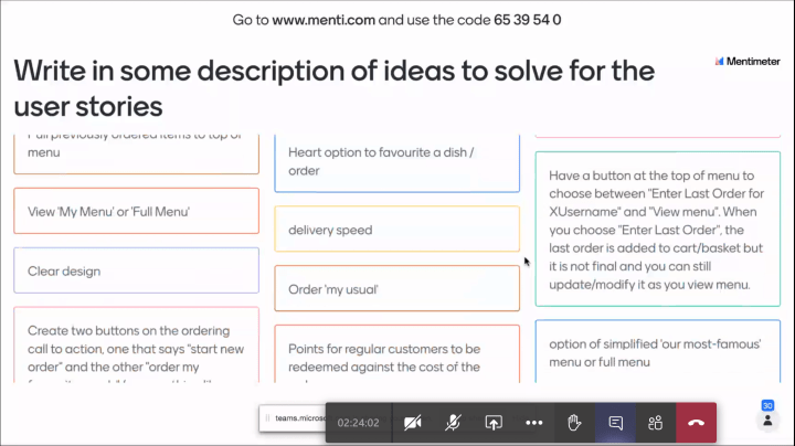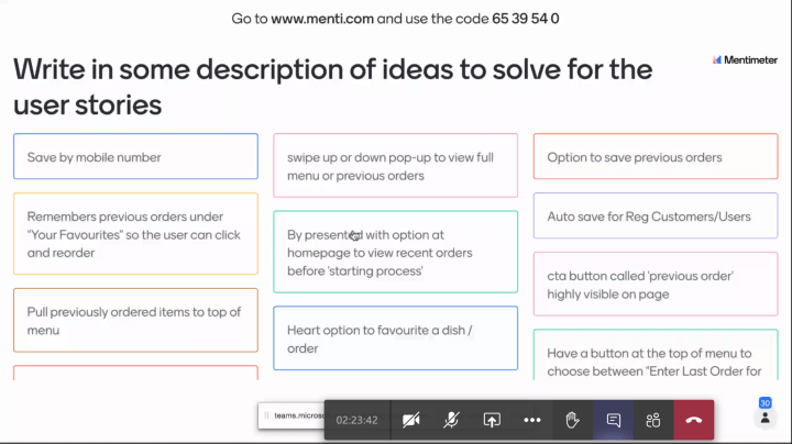 As a group we then voted for the two user stories we find most important and would like to resolve in our prototype. These were no.3 and no.6. From this we then began our group ideation process by first making suggestions to resolve the respective pain points. Due to the local Covid19 lockdown, this had to be done remotely and we used www.menti.com to each make suggestions for review and exploration, keeping as creative as possible, not limiting to technical feasibility at this stage as we want to come up with the most novel solutions to User problems so as to truly create a new product that utilises the tools of UX. Here are screenshots of several of the group’s suggestions:
