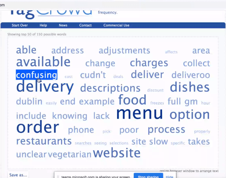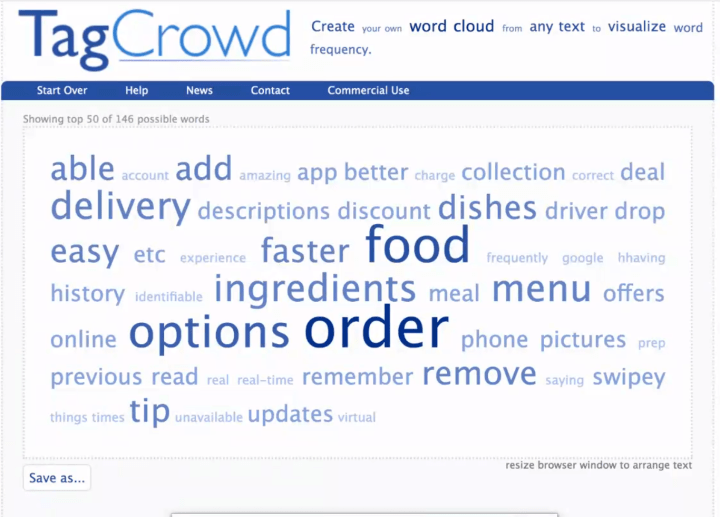The last two questions are open questions asking for a pain point in previous experience, and a suggestion for a food ordering website. We ran all the answers through a online Word Crowd program (Tag Crowd, tagcrowd.com) and had the following results: