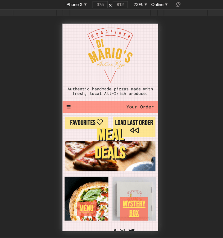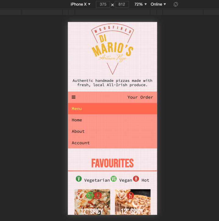 There is some responsiveness that was applied to the website using Media Queries. However I set my media query max-width at 500px and when I accessed the site on the phone, some elements were clearly still too big. A media query can be applied to the header logo as well as it takes up half of the screen on the phone. I would like to point out two instances of successful responsiveness, first being the nav bar and also the resizing of the contact and payment forms. Although Lighthouse rates the site 82% for SEO, I know that I did not add any SEO into the code and simple meta tags can be added to identify the site better. There is however clear branding such as the slogan “Authentic handmade pizzas made with fresh, local all-Irish produce”, and keywords in the description on the About page. These are opportunities that can be added into the site’s SEO. Considering social media influencers to be one of the target audiences in the client brief, more can be added to the site to link it with sites like Twitter and Instagram for greater promotion and opportunities for customers to review.