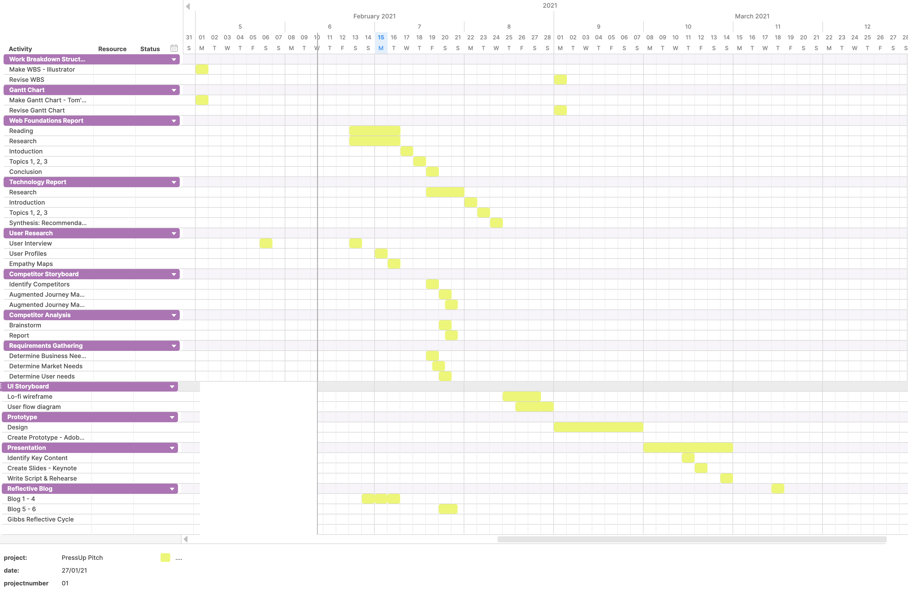 While I feel that this version of my Gantt Chart is a good start to the project, it can certainly afford more room for flexibility, and to allocate time for iteration of the tasks which is an important practice in UX research. In software development there is a project management methodology called Agile. In Agile, you start with an initial goal and set out the tasks to achieve this goal, along a rough timeline. However, tasks adapt to changing project needs. For example, in my gantt chart, items highlighted purple represent a group of tasks. If each group of tasks is treated as a “mini project” and the timeline accommodates one group taking a longer time time than anticipated to complete and vice versa, Agile perhaps provides flexibility that considers newfound strengths and weaknesses, allowing the project manager to strategise as he/she goes along. This is especially essential when working in a team. While this brief is an individual project, I would like to adopt some Agile methodology in my project management for experience, and revise my WBS and Gantt chart at the scheduled 1 March, allowing me to firstly see the changes that I make to my strategy, and secondly conclude my strengths and weaknesses in software development for future reference.